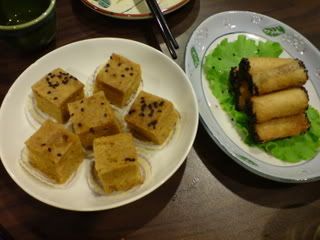 dessert. i have no idea what cake that was - i only know it was sponge cake. the other plate with rolls of thingy was yam roll with black sesame. lalalala. but the best was the yam paste - super good. i love yam paste with pumpkin. =D i like. i like. hahah anyway i think i will try to get my friends over there soon. =D
